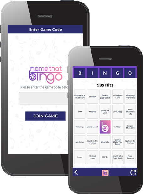 The Name That Bingo app is available on the App Store (iOS) or Google Play (Android). The host will also provide a QR code for easy access to the app.